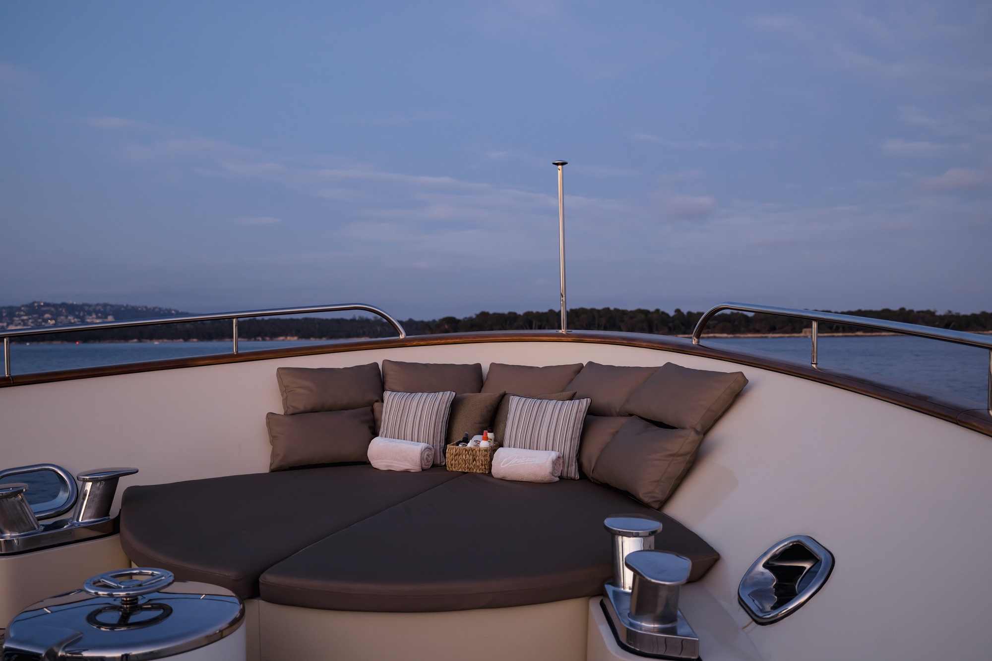 The aft space can be used for storing water toys while underway and for sunbathing when at anchor.