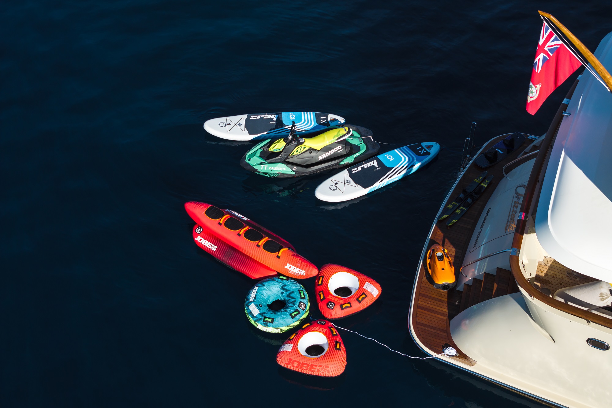 NOTABLE FEATURES OF ORIZZONTE: ~Classic design ~Spacious sun deck ~ Approved RYA water sports centre ~Loads of water toys ~At anchor and underway stabilisers ~Air conditioning ~WiFi