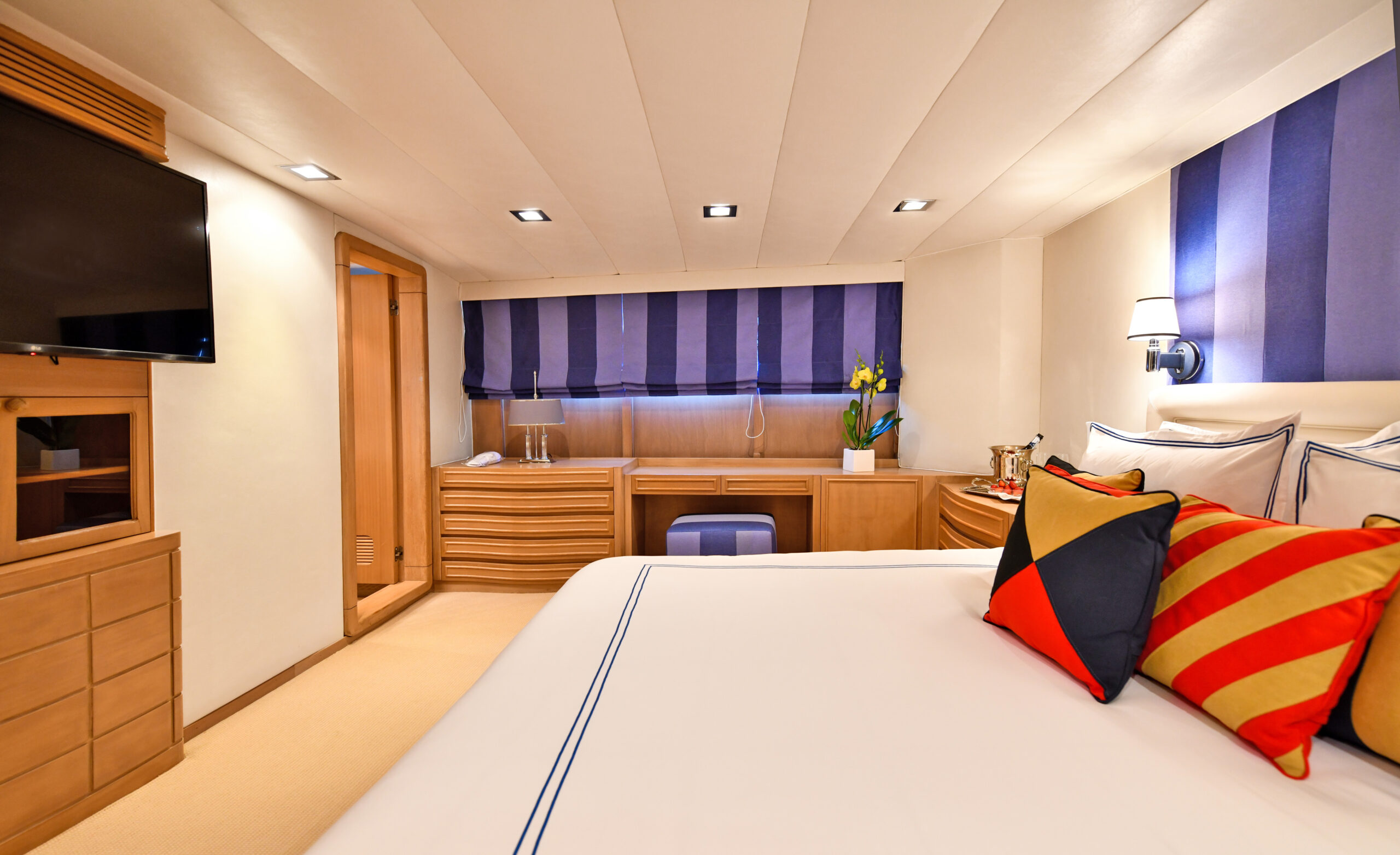 She can accommodate up to 12 guests in 7 suites, looked after by a crew of ten.