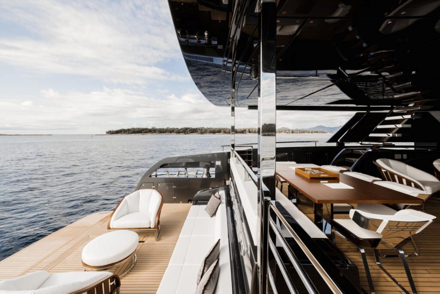 On the upper deck the aft space is set with a huge dining table to seat everyone on board while they eat dinner al fresco. The stern area is zoned with a beach club and generous cockpit creating over 60sqm of liveable space. The bow area creates a private exterior terrace for the master suite with a jacuzzi, lounge and sun pad.