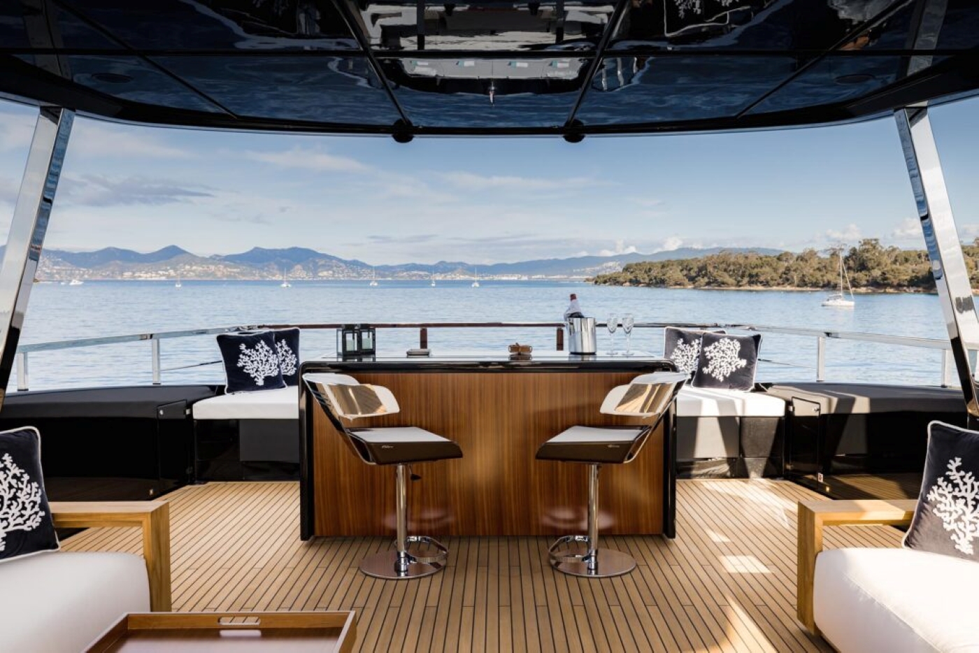On the upper deck the aft space is set with a huge dining table to seat everyone on board while they eat dinner al fresco. The stern area is zoned with a beach club and generous cockpit creating over 60sqm of liveable space. The bow area creates a private exterior terrace for the master suite with a jacuzzi, lounge and sun pad.