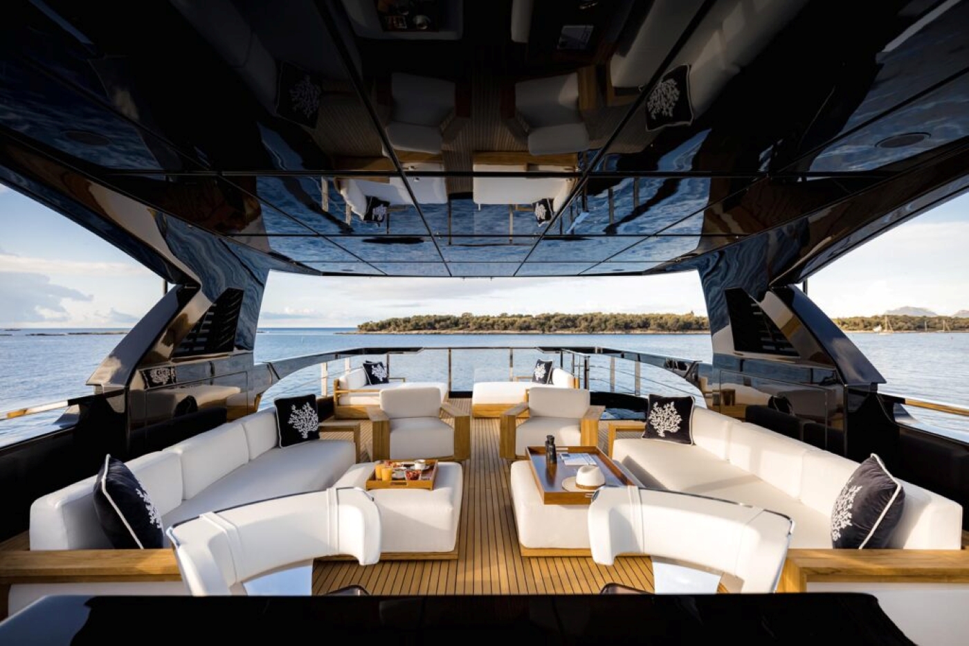 On the upper deck the aft space is set with a huge dining table to seat everyone on board while they eat dinner al fresco. The stern area is zoned with a beach club and generous cockpit creating over 60sqm of liveable space. The bow area creates a private exterior terrace for the master suite with a jacuzzi, lounge and sun pad.