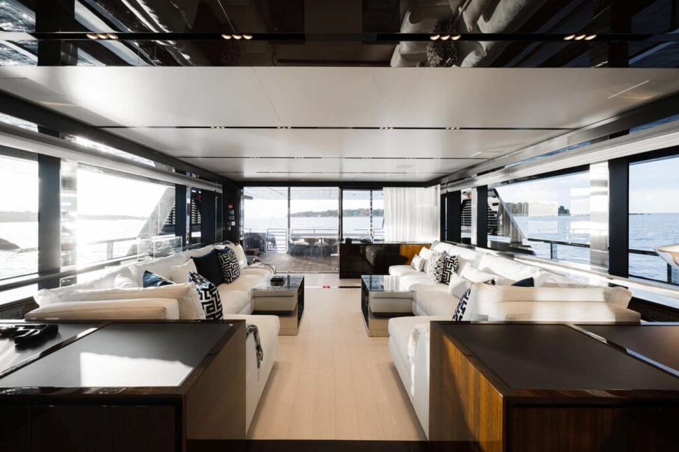 The interiors feature a main salon surrounded by glass which fills the space with light and gives unimpeded 270-degree views. The high ceilings (2m+) and a wide beam (8m) create a one-of-a-kind space which is further enhanced by the designer finishes and furnishings.