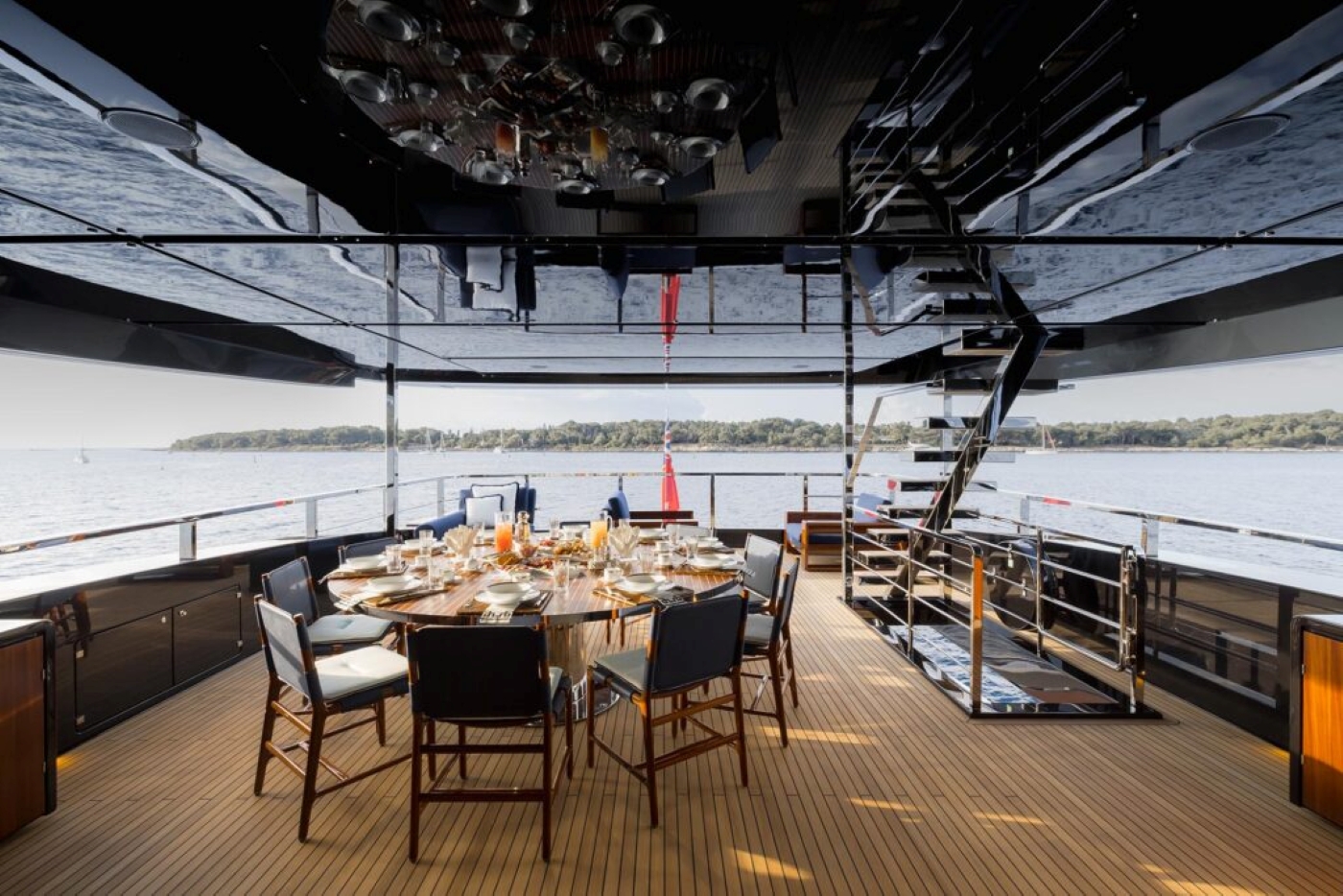 On the upper deck the aft space is set with a huge dining table to seat everyone on board while they eat dinner al fresco. The stern area is zoned with a beach club and generous cockpit creating over 60sqm of liveable space. The bow area creates a private exterior terrace for the master suite with a jacuzzi, lounge and sun pad.