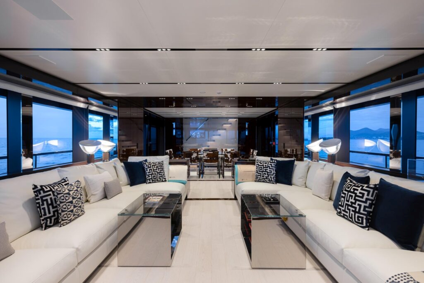 The interiors feature a main salon surrounded by glass which fills the space with light and gives unimpeded 270-degree views. The high ceilings (2m+) and a wide beam (8m) create a one-of-a-kind space which is further enhanced by the designer finishes and furnishings.