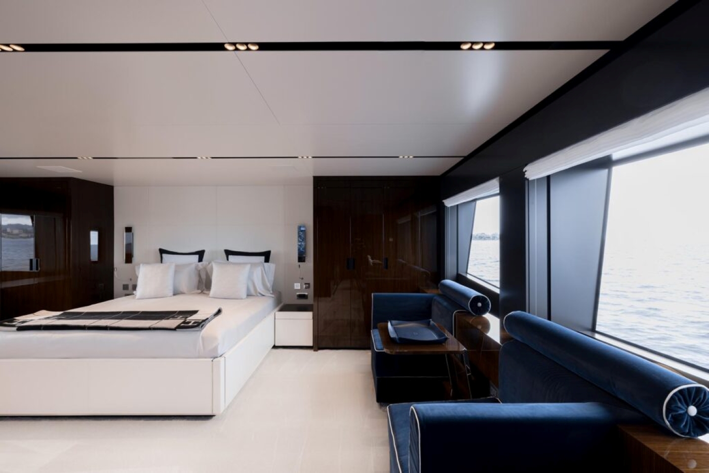 The fabulous master suite, forward on the main deck offers a private haven for primary charter guests and includes access to the private bow terrace, lounge area, generous wardrobe and luxury ensuite.