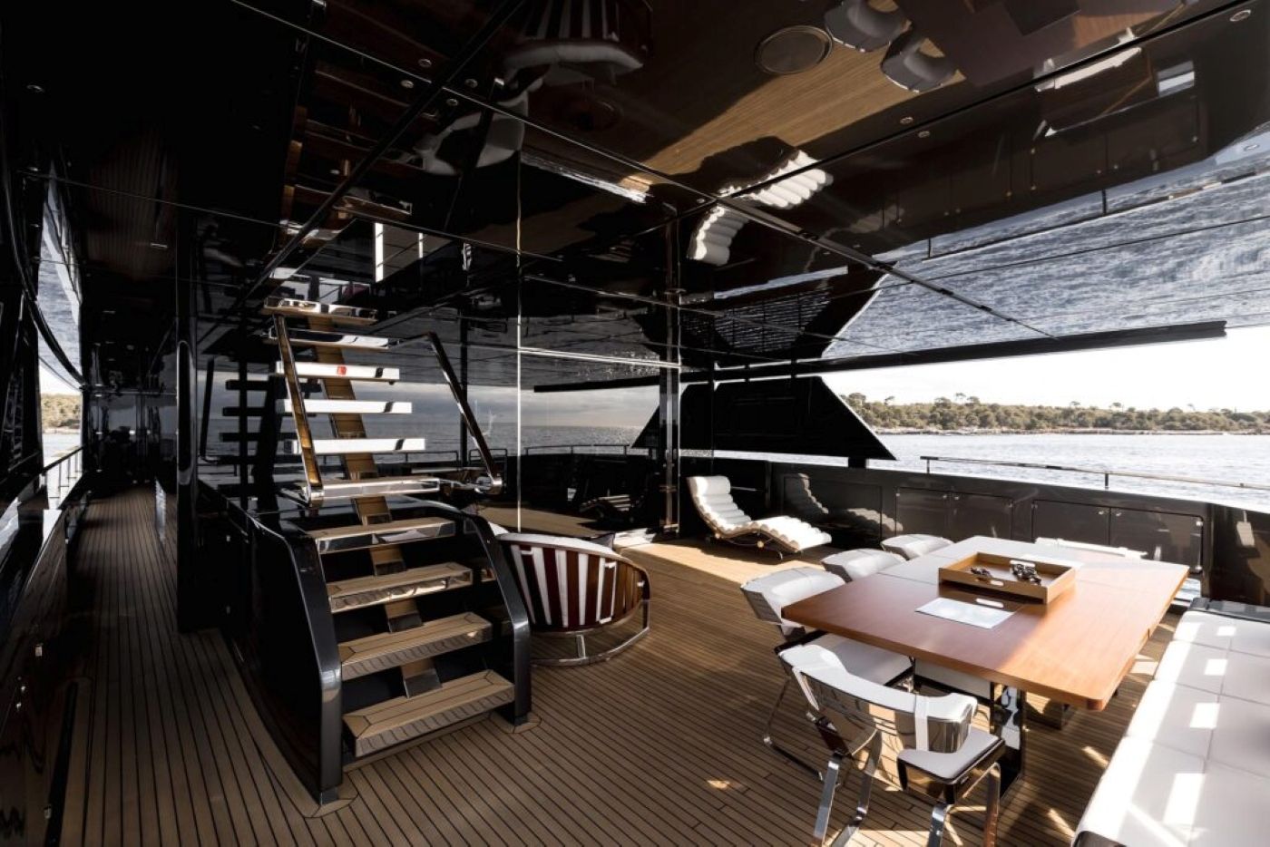 On the upper deck the aft space is set with a huge dining table to seat everyone on board while they eat dinner al fresco. The stern area is zoned with a beach club and generous cockpit creating over 60sqm of liveable space. The bow area creates a private exterior terrace for the master suite with a jacuzzi, lounge and sun pad.