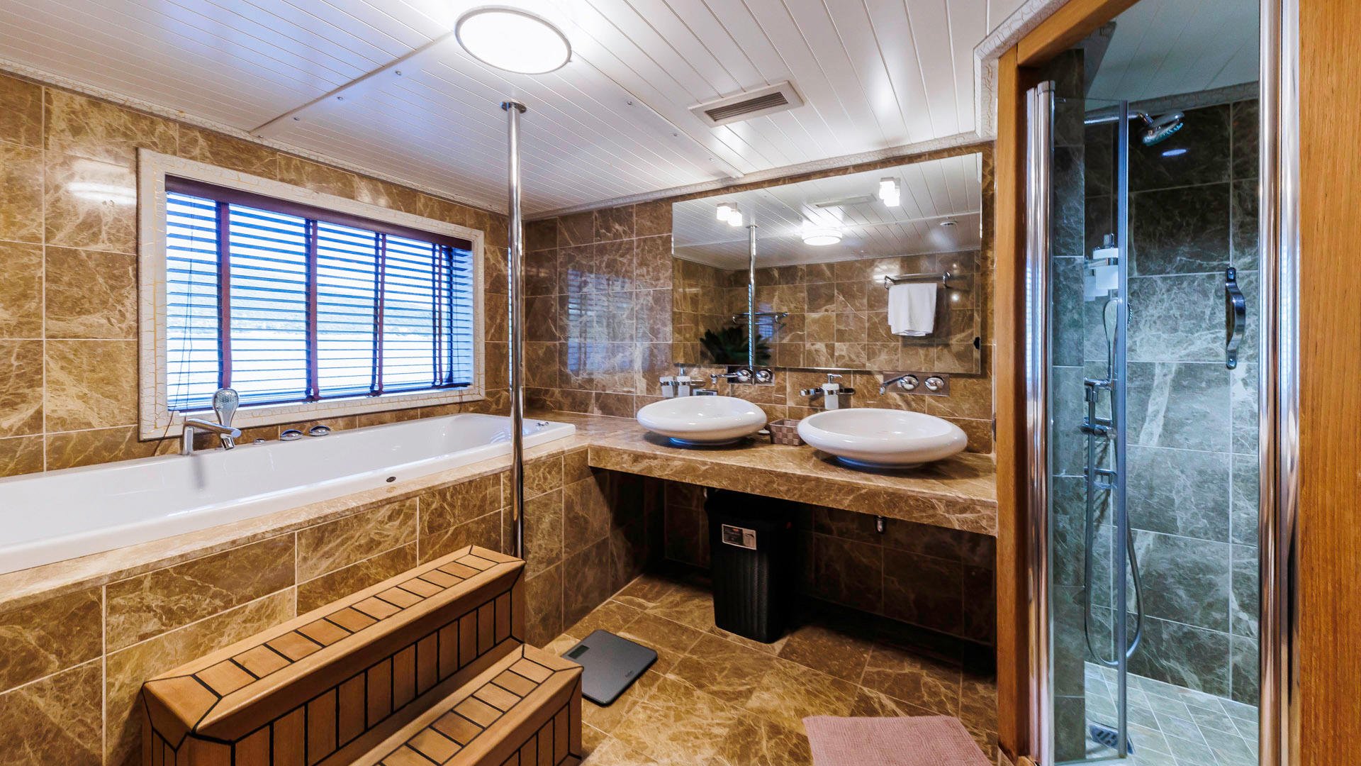 The guest accommodation is configured as two king-sized, three queen-sized and one twin stateroom, all with ensuite bathroom facilities.