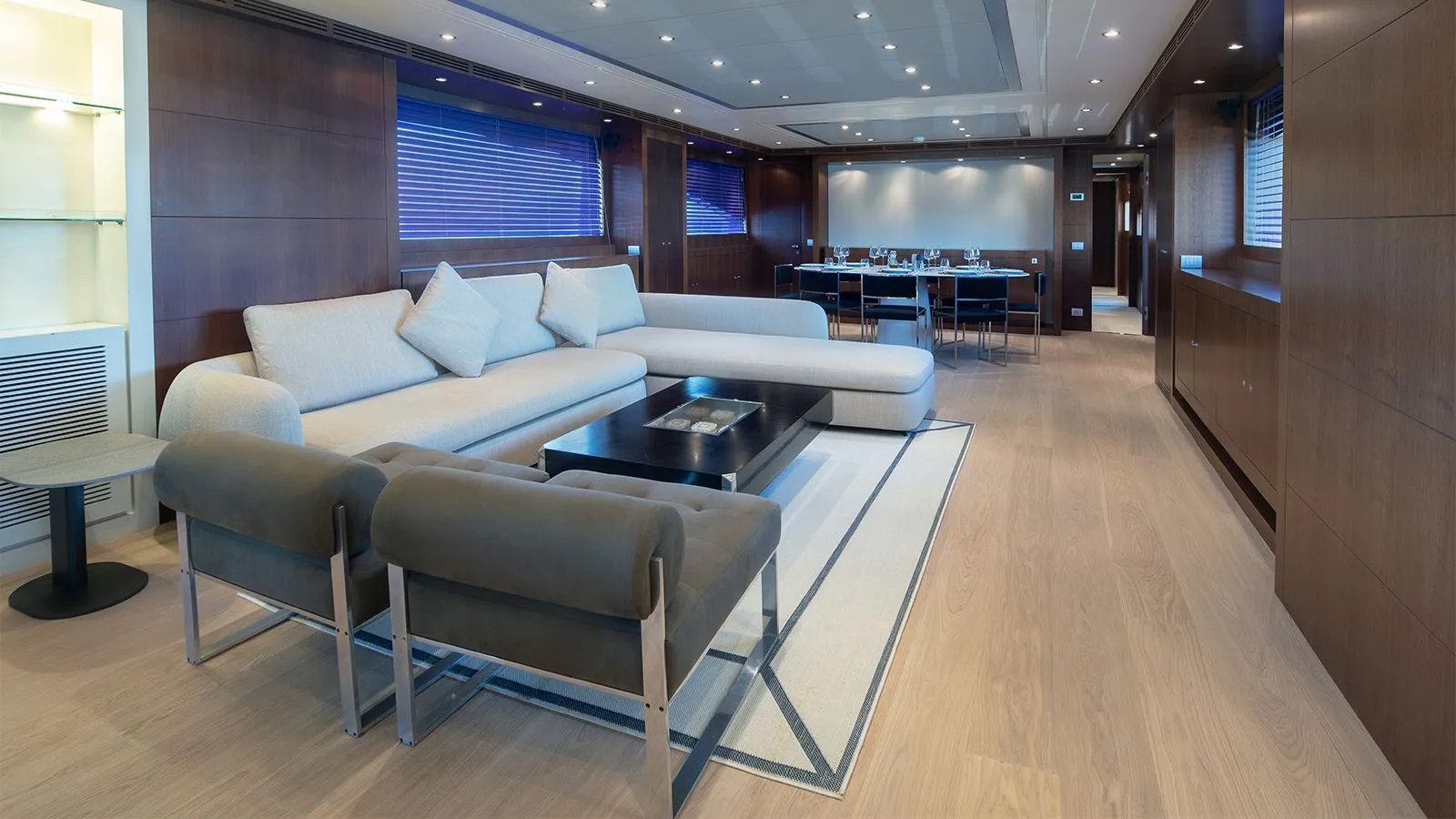 The main salon is a stylish space with light wood floor, darker wood panelling on the walls and neutral soft furnishings. There is a welcoming lobby as you enter from the main deck aft into the salon, a plush, low sofa in an L-shape and occasional chairs create a lovely lounge area and forward in the space is an oval dining setting.