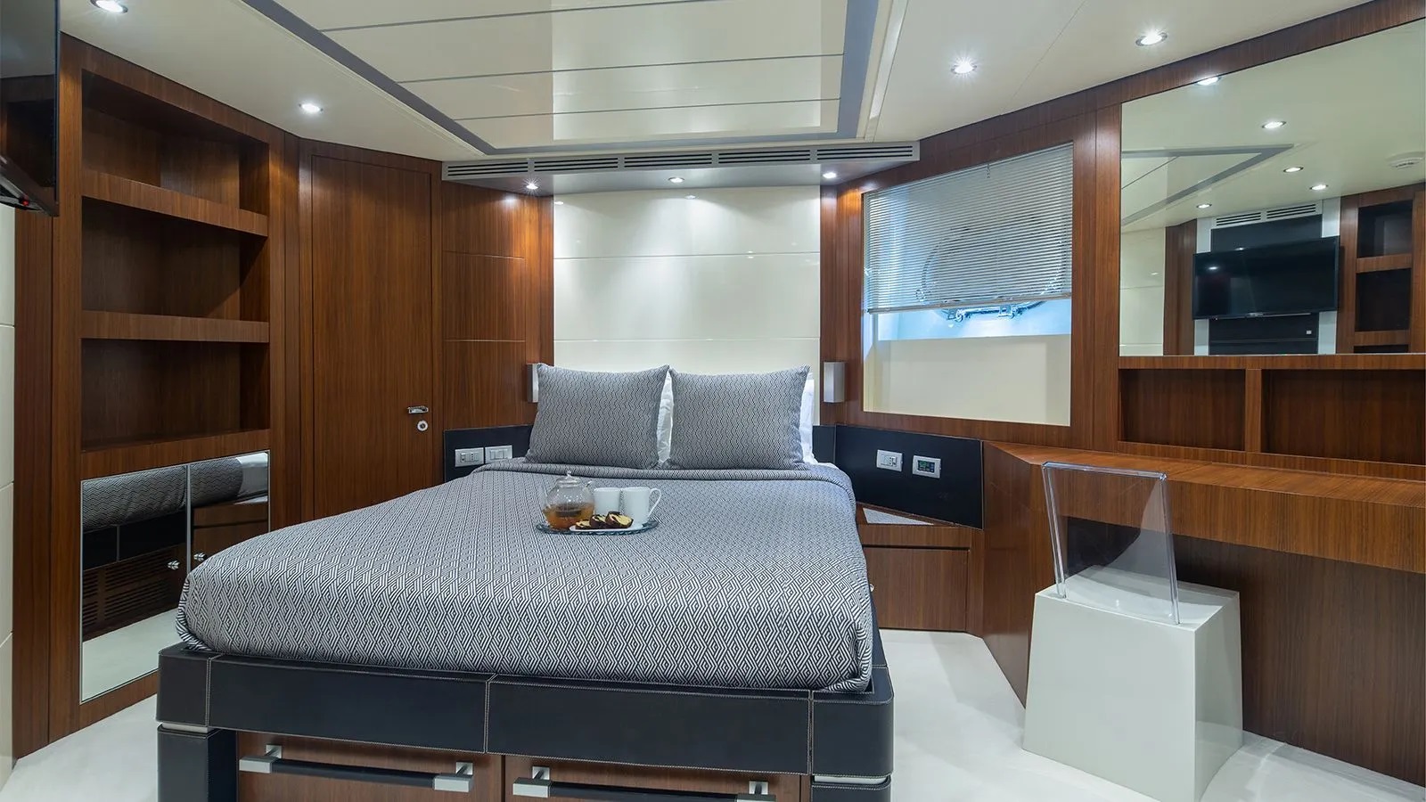 The accommodation is configured as a main deck master suite offering primary charter guests a wonderful private haven with marble and wood panelled ensuite bathroom.