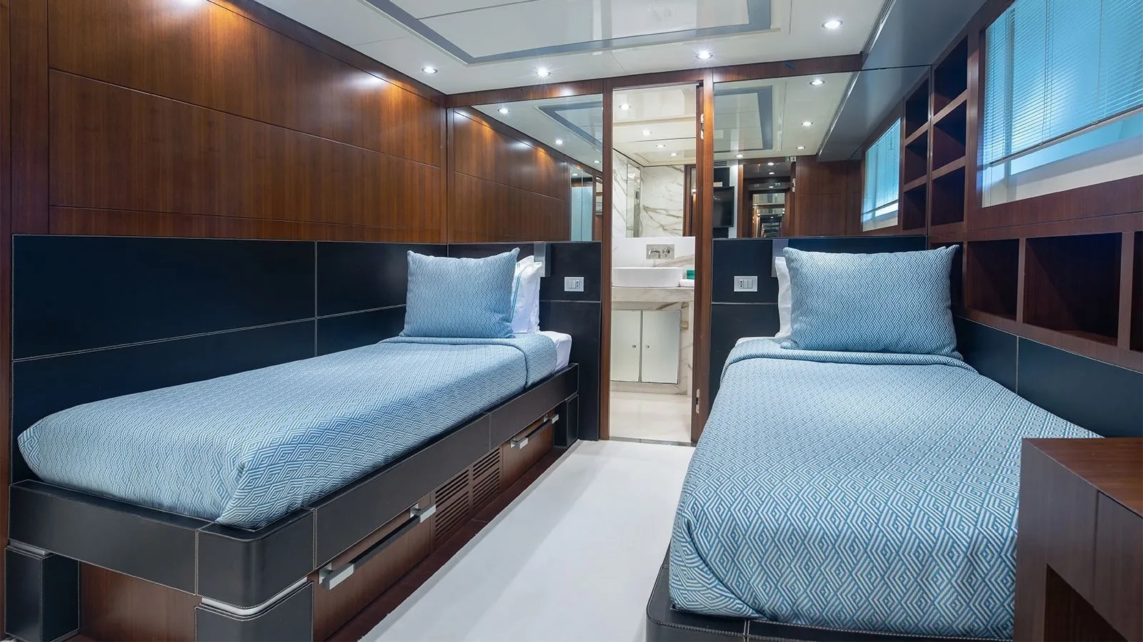 The accommodation is configured as a main deck master suite offering primary charter guests a wonderful private haven with marble and wood panelled ensuite bathroom.