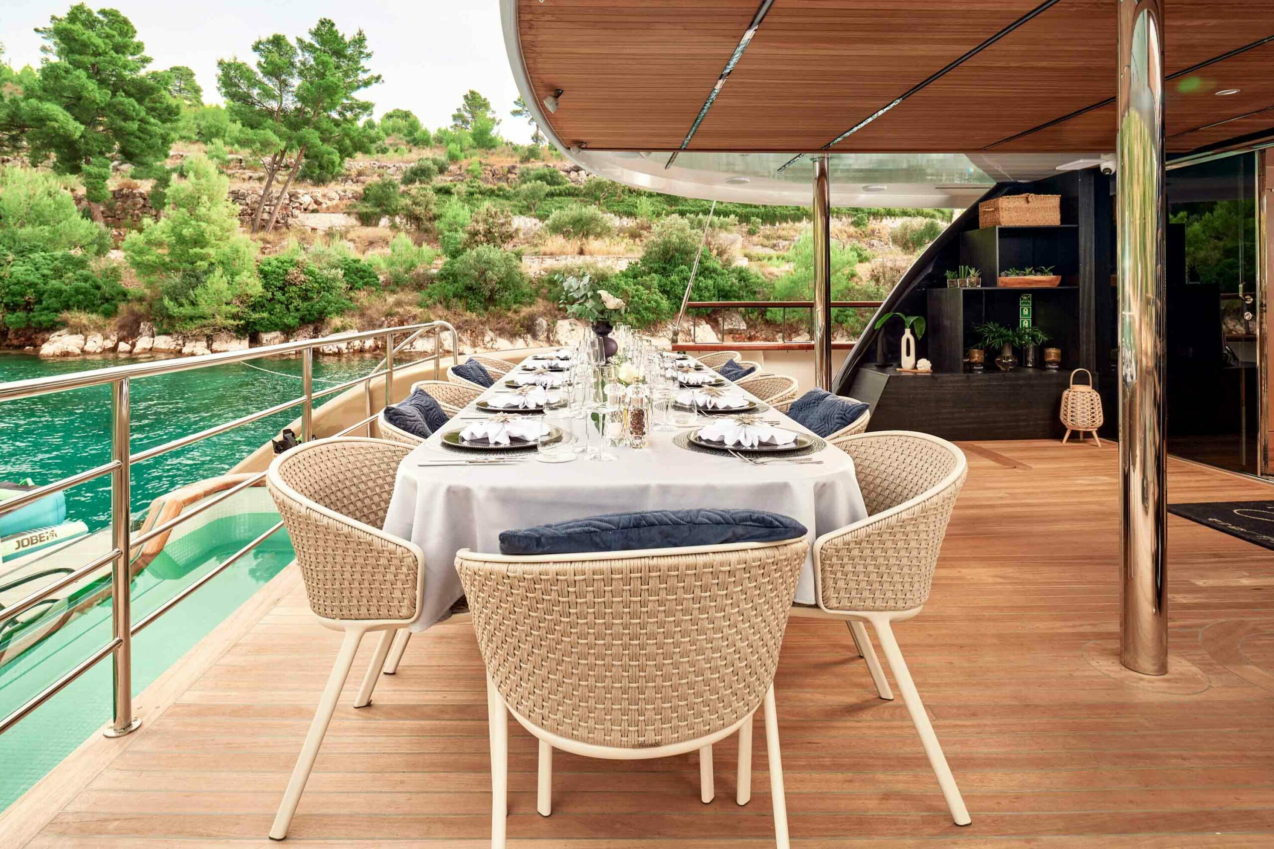 A wide seawater pool on the aft deck is glass fronted connecting it to a large swim platform which gives an open, panoramic feeling out across the water.