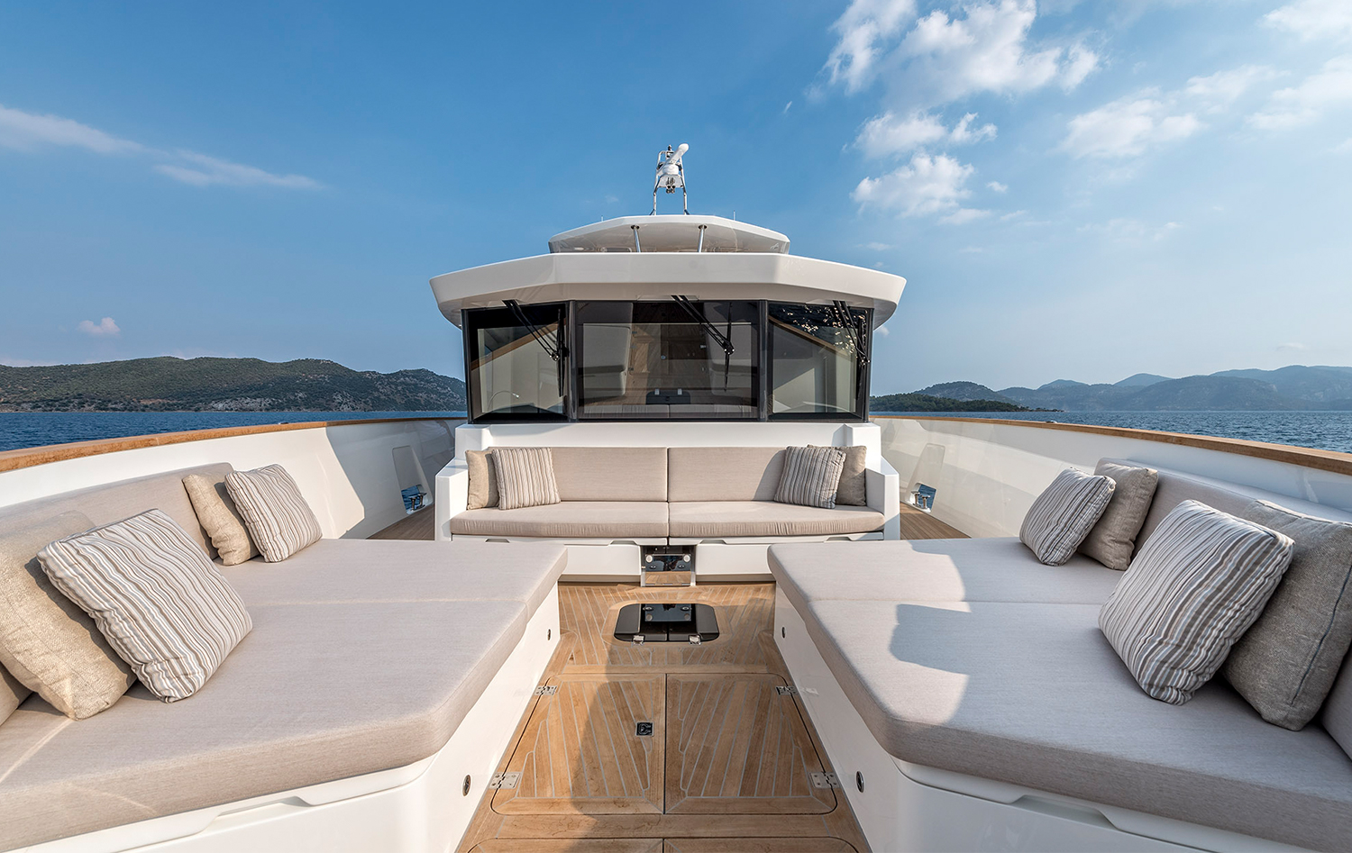 On the bow is another seating area with sun pads either side and a forward facing sofa under the wheelhouse windscreen.