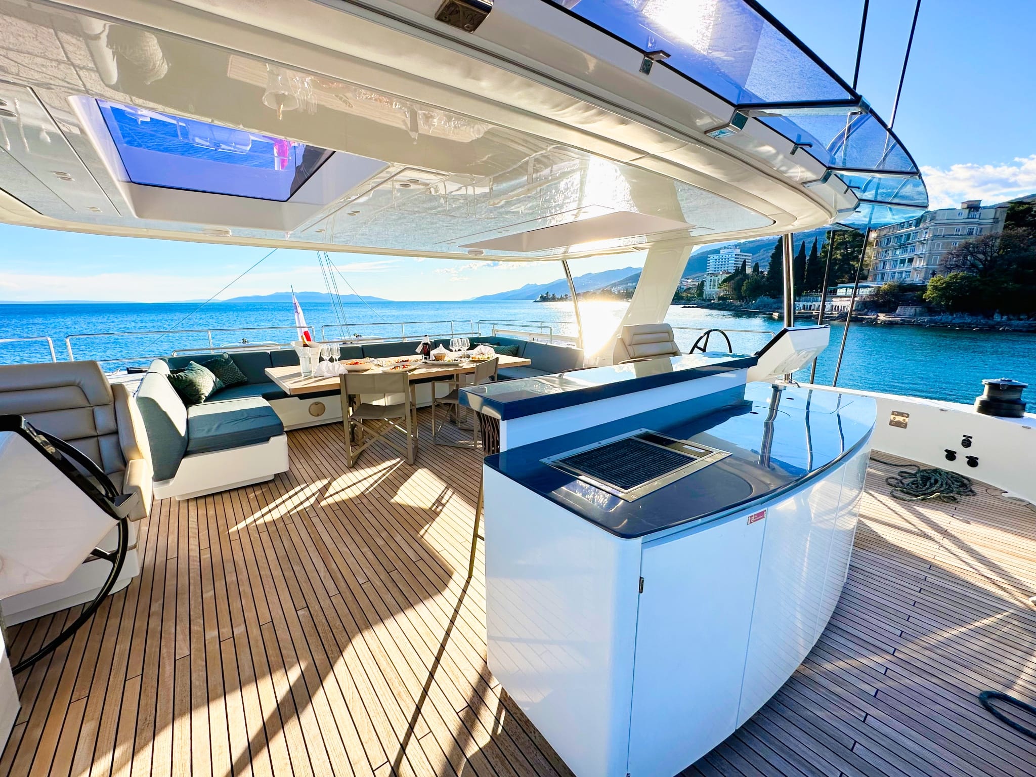 The aft cockpit provides guests an alternative al fresco dining space sheltered under the flybridge overhang.