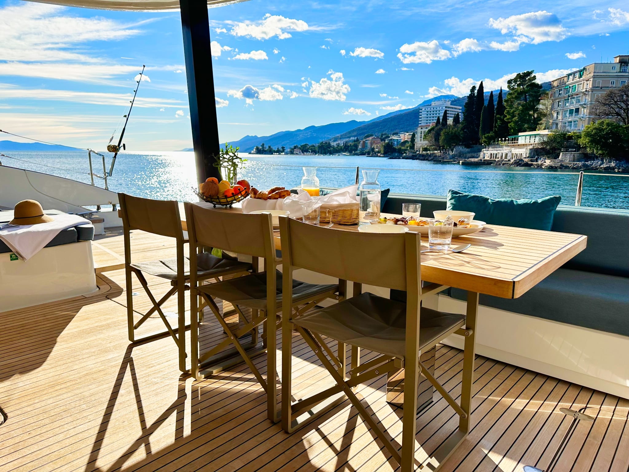 The aft cockpit provides guests an alternative al fresco dining space sheltered under the flybridge overhang.