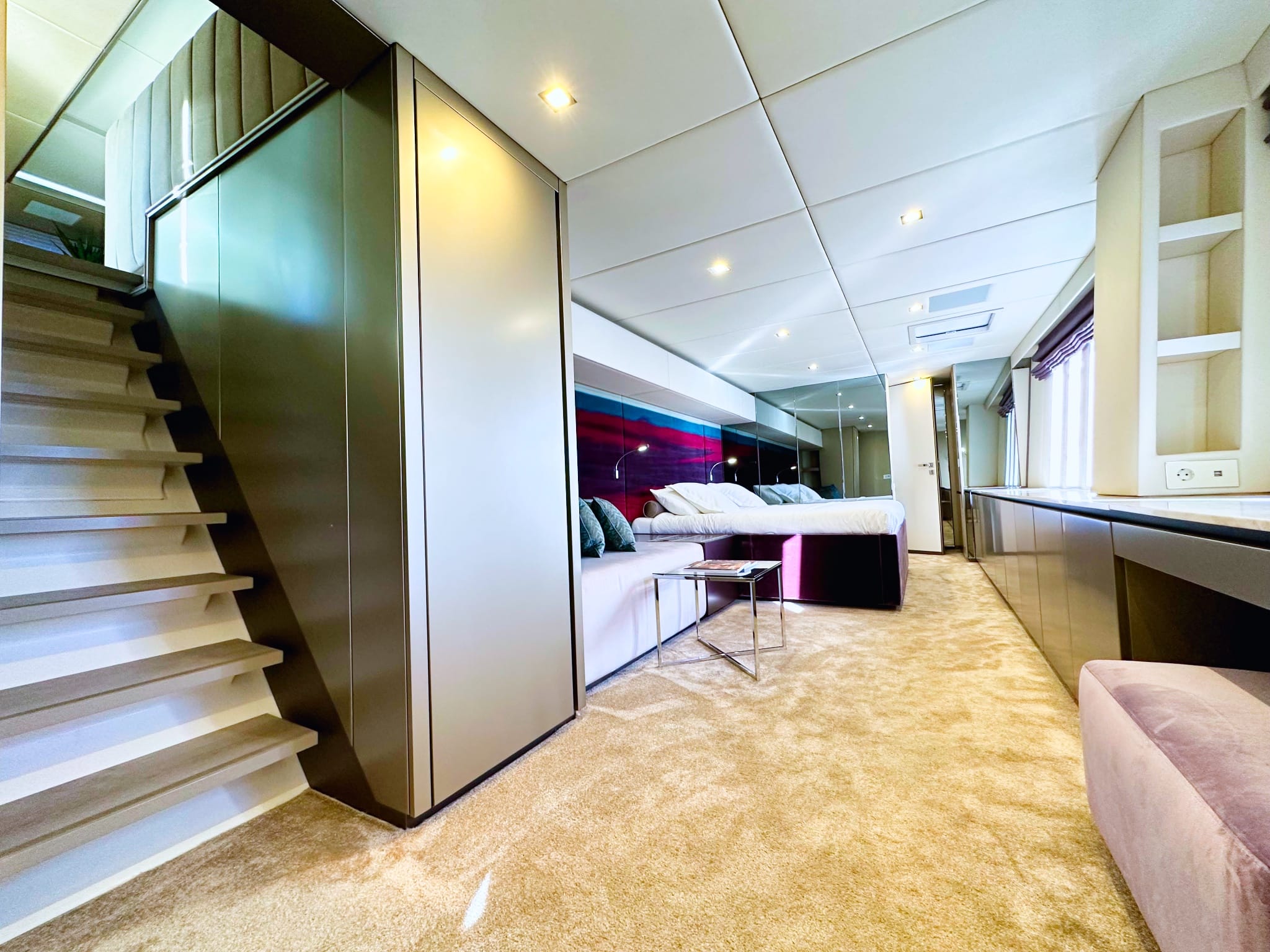 On the lower deck are three lovely ensuite double cabins which echo the décor of the main salon. Tenders & Toys: