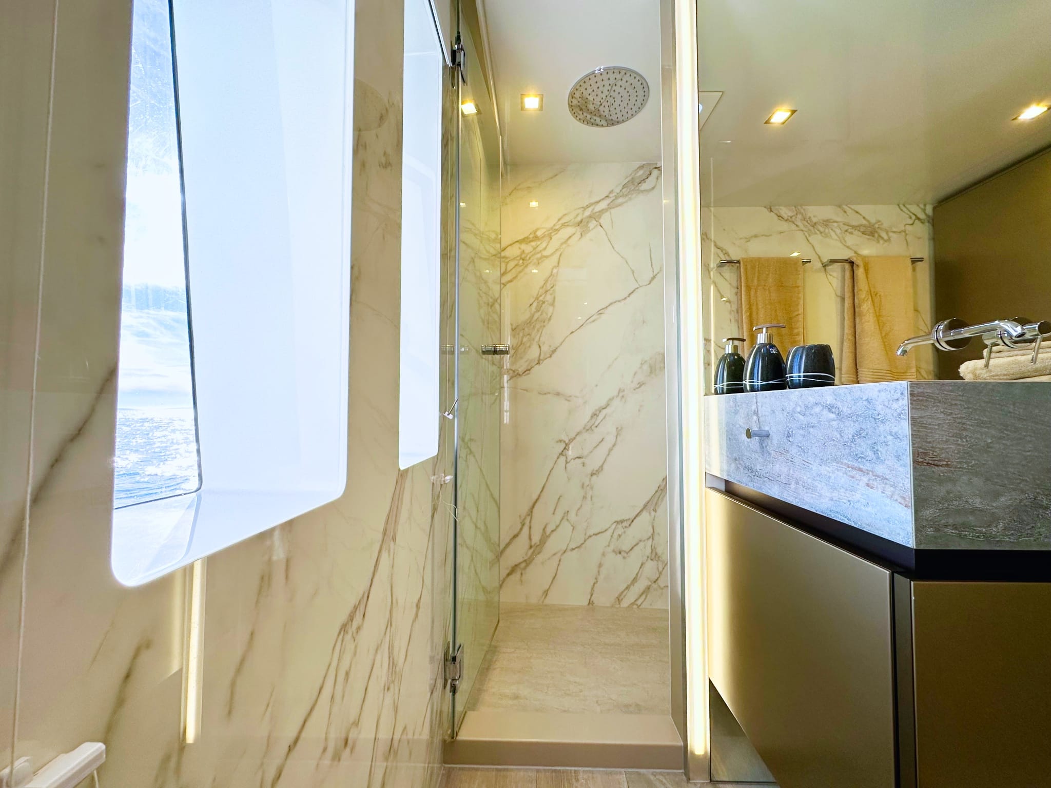 On the lower deck are three lovely ensuite double cabins which echo the décor of the main salon. Tenders & Toys:
