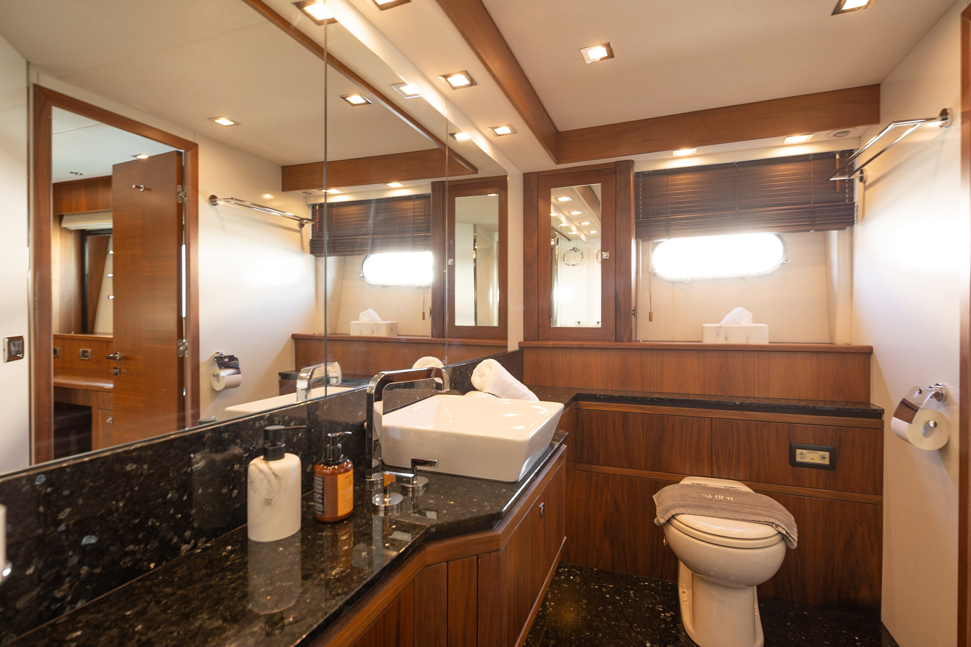 On the lower deck there are four staterooms configured as a forward full beam VIP in the bow with walk around bed, walk in wardrobe and ensuite bathroom. Two twin cabins are amidships, one on each side and aft is the huge full beam master with its lounge area, desk / vanity, walk in wardrobe and ensuite bathroom.