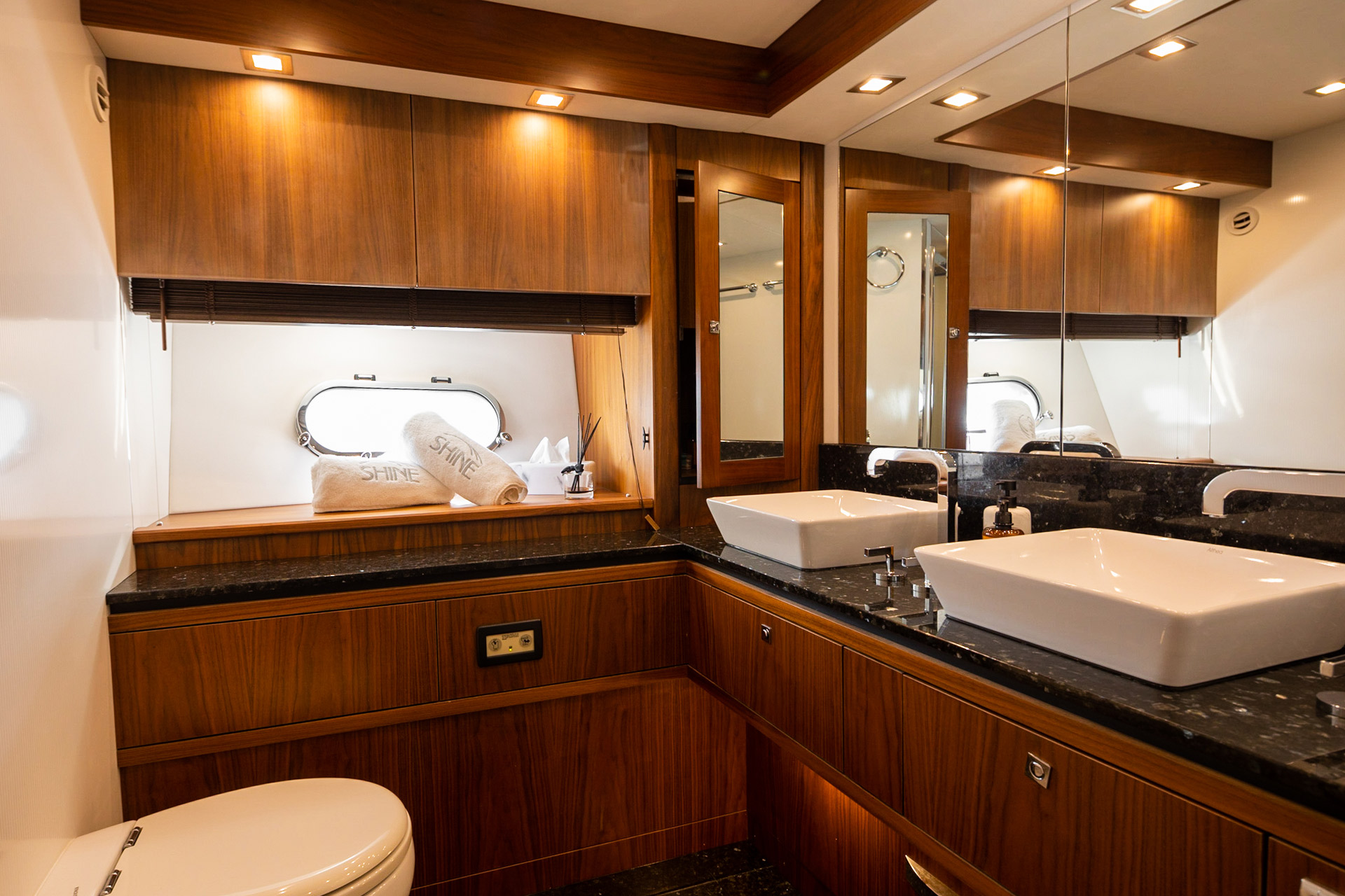 On the lower deck there are four staterooms configured as a forward full beam VIP in the bow with walk around bed, walk in wardrobe and ensuite bathroom. Two twin cabins are amidships, one on each side and aft is the huge full beam master with its lounge area, desk / vanity, walk in wardrobe and ensuite bathroom.