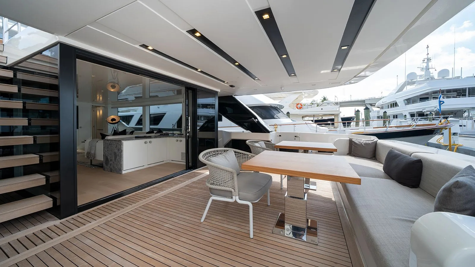 The sociable sun deck is zoned with a lounge and bar aft, amidships dining setting and forward helm controls.