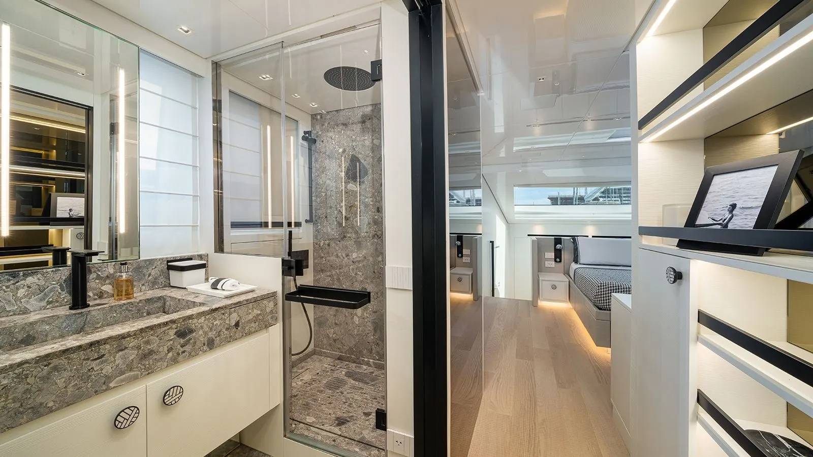 The lower deck cabins are decorated to complement the master and are very spacious and light configured as two double and two twin.
