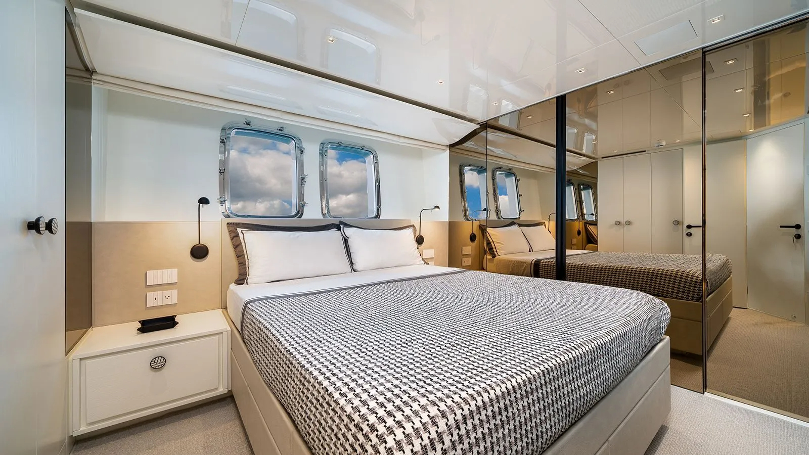 She can accommodate up to ten guests in five suites and has separate cabins for four crew members.