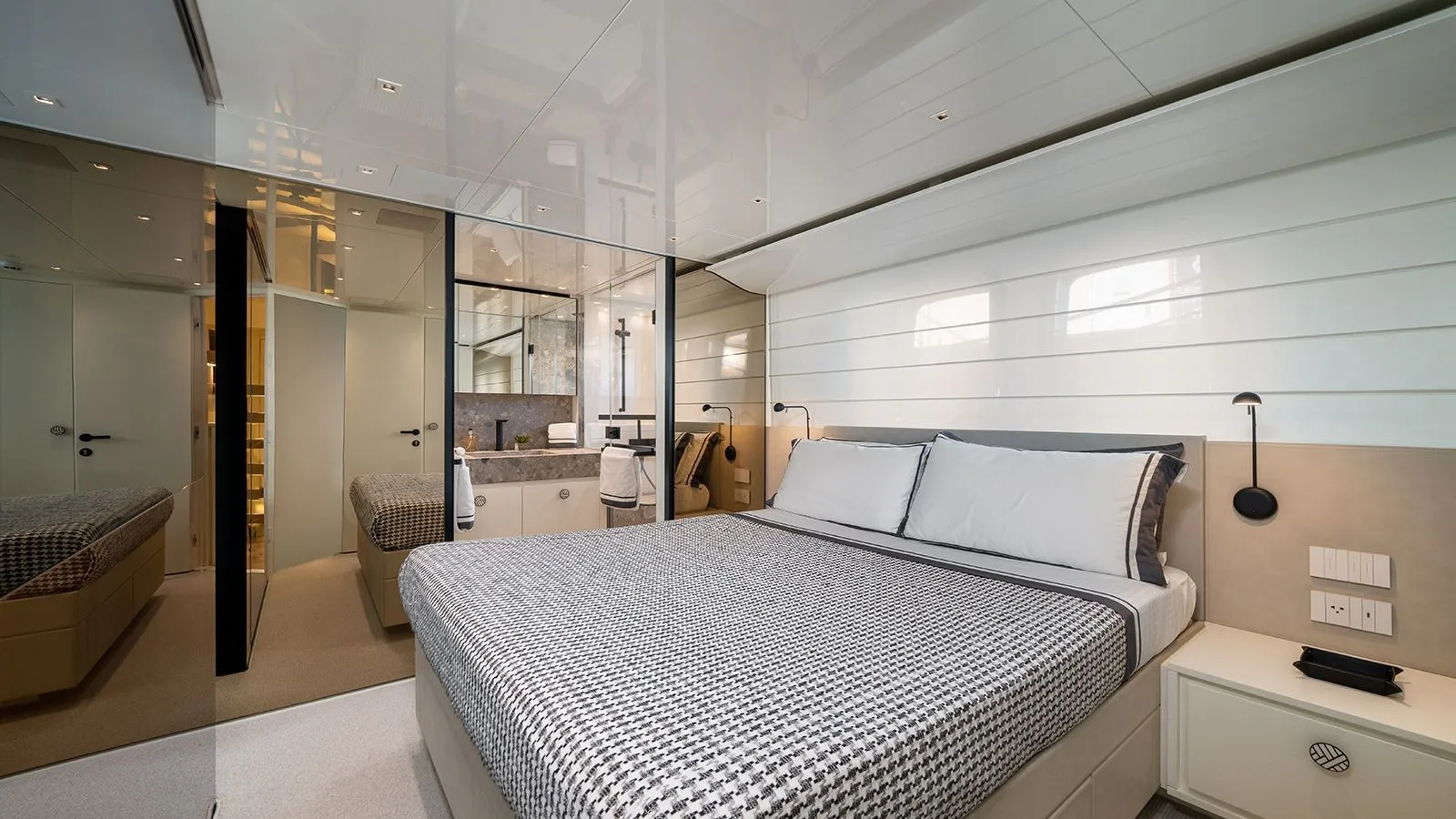 She can accommodate up to ten guests in five suites and has separate cabins for four crew members.