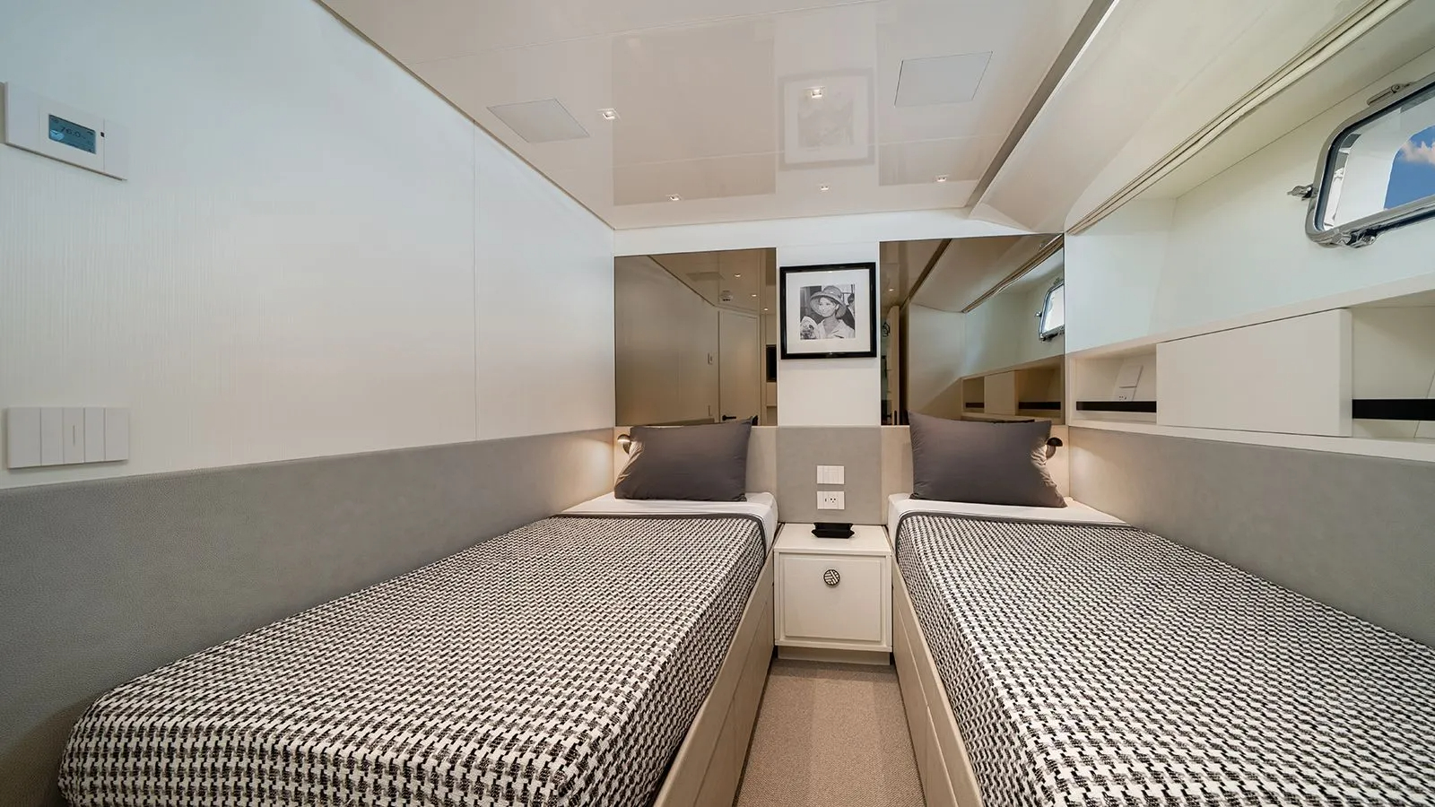 She can accommodate up to ten guests in five suites and has separate cabins for four crew members.