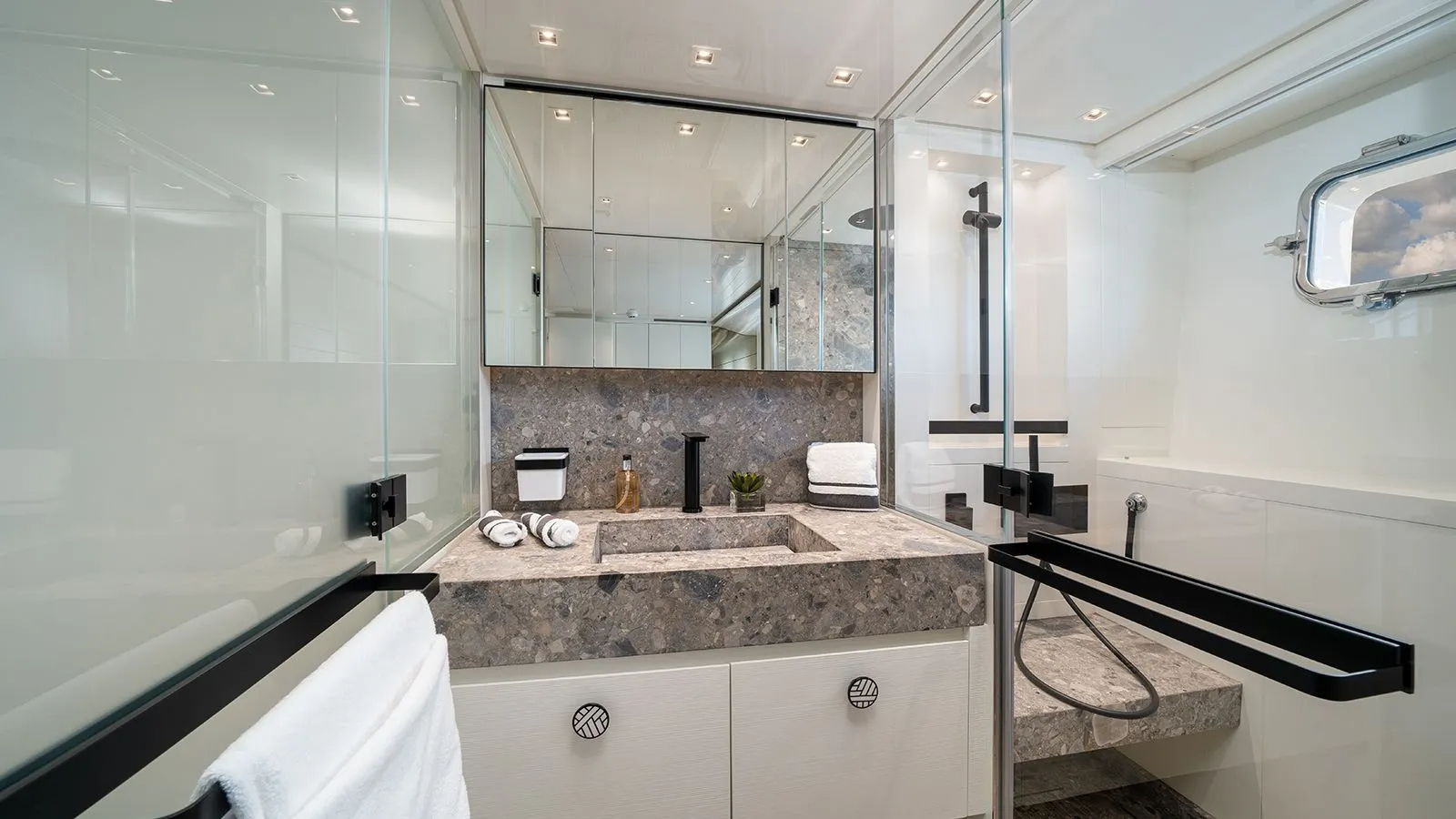 The lower deck cabins are decorated to complement the master and are very spacious and light configured as two double and two twin.