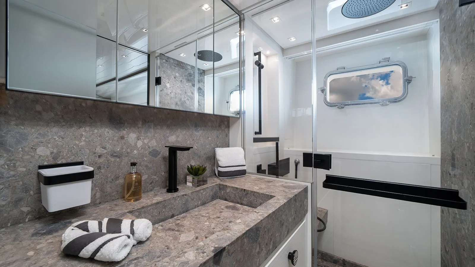 The lower deck cabins are decorated to complement the master and are very spacious and light configured as two double and two twin.