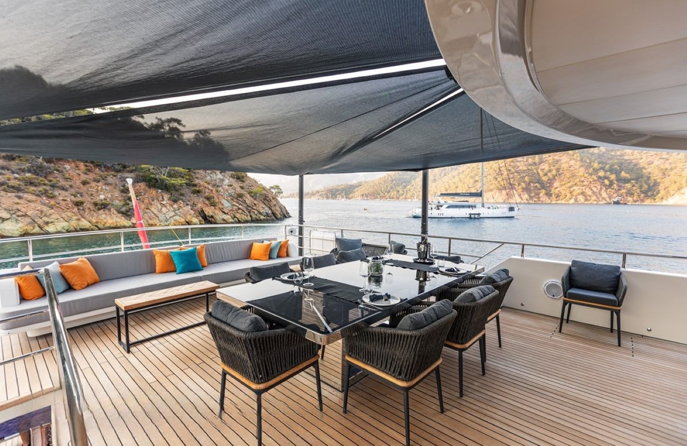 The upper deck aft is another lovely sociable space which can be covered with a soft bimini shade adding shelter over the dining table. There is a long sofa aft on the deck where guests can relax before or after dinner.