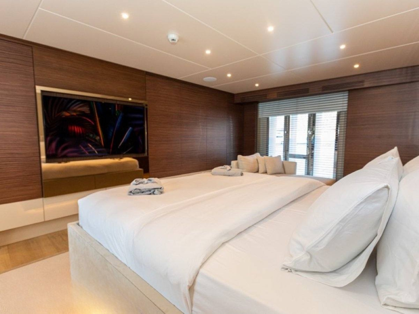 The lovely main deck master suite is a private haven for primary charter guests and offers a lounge area, vanity/desk and his and hers ensuites joined centrally by a huge shower cubicle.