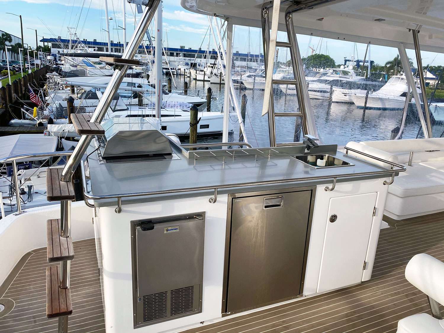 RUBY ONE showcases a large fly bridge with custom lounge couches and a wonderful BBQ area.