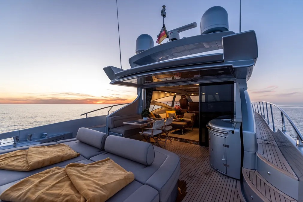 On the aft deck there is a row of sun pads which can be used aft or forward facing and covered by a soft bimini shade if needed.
