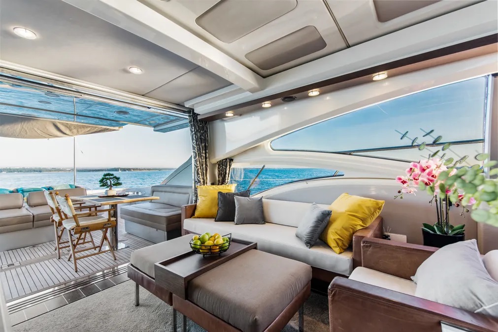The wide glass doors open to create one large space incorporating the cockpit and salon.