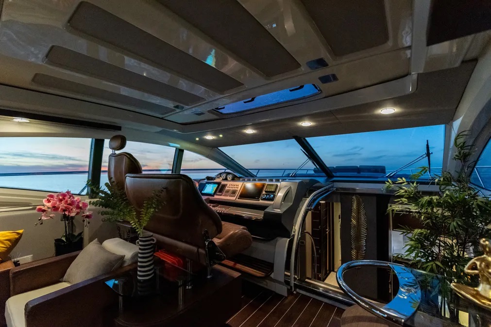 The interior was designed by Stefano Righini and Carlo Galeazzi and is a lovely blend of rich leather, cleverly designed flexible furniture and lovely fabrics. The main salon features a starboard side dining table containing a hidden TV and a lounge to port with additional stools which can be moved to be adjacent to the table.