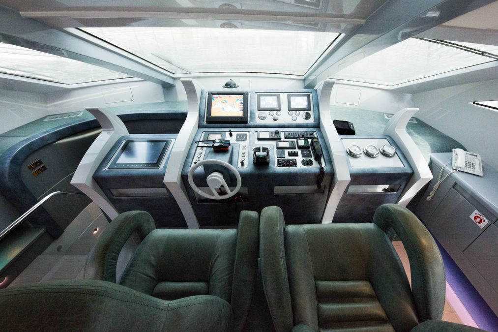 The warm and inviting interior is configured with a main deck salon featuring open plan lounge, dining and helm controls. The curved leather sofa is very practical for charters and allows guests to gather centrally while the generous dining table can seat up to eight guests.