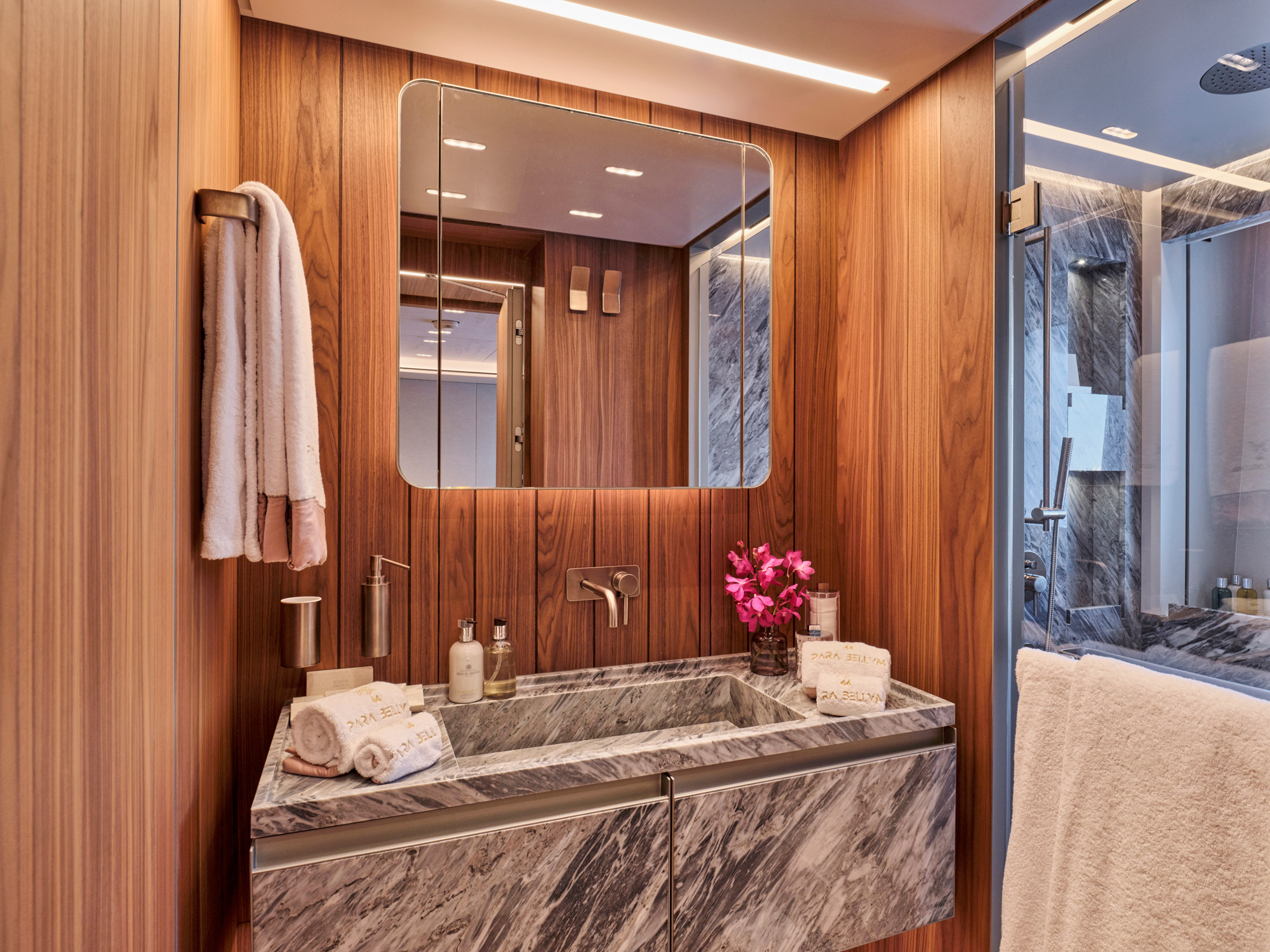 The stylish, private owners suite fills the forward space on the main deck and features full beam main cabin, port side owners office (convertible to a double suite with its own ensuite), walk in wardrobes, forward ensuite and starboard side fold out balcony.