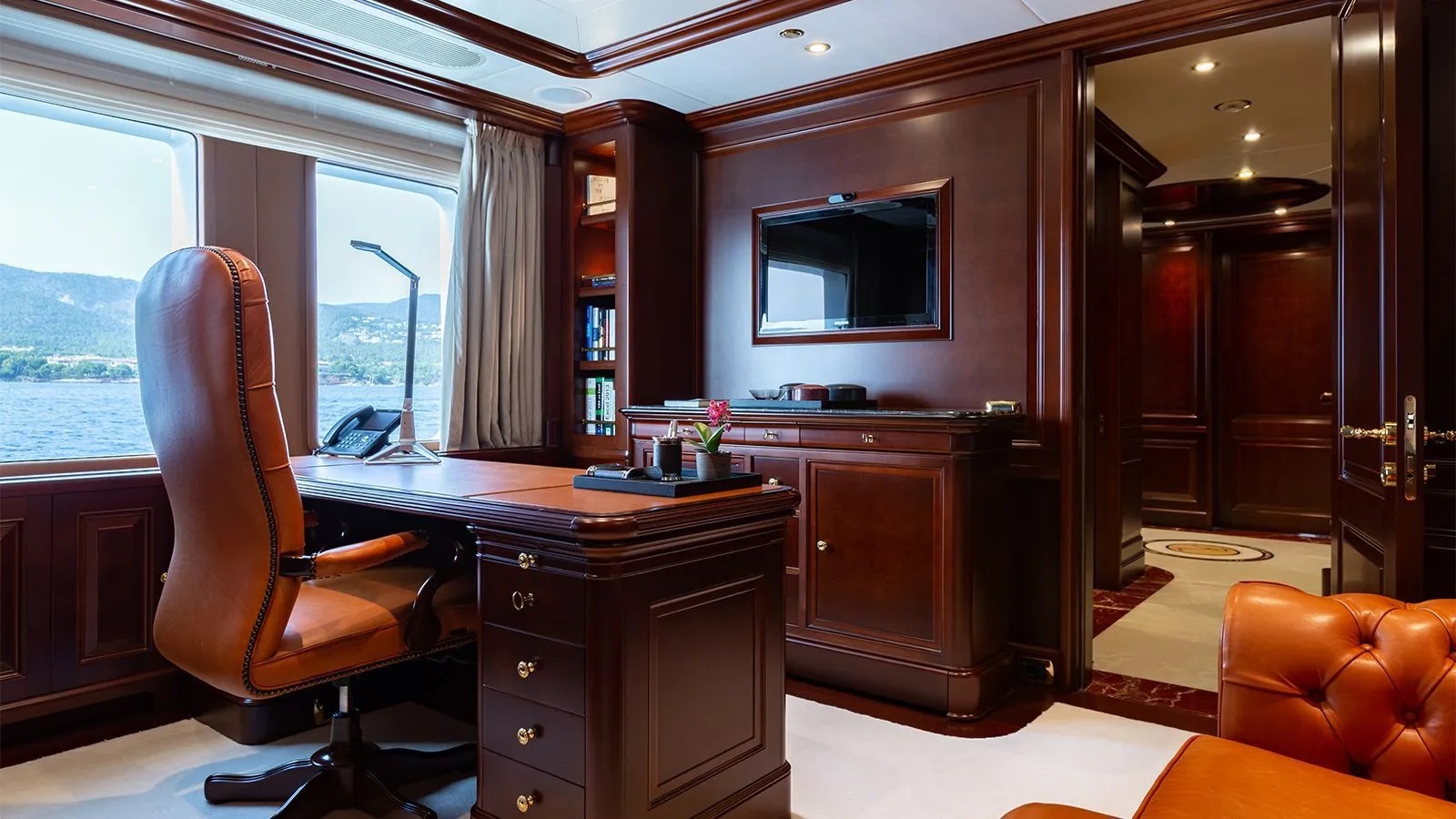 Forward on the main deck is the owner’s suite which boasts a private office and huge ensuite.