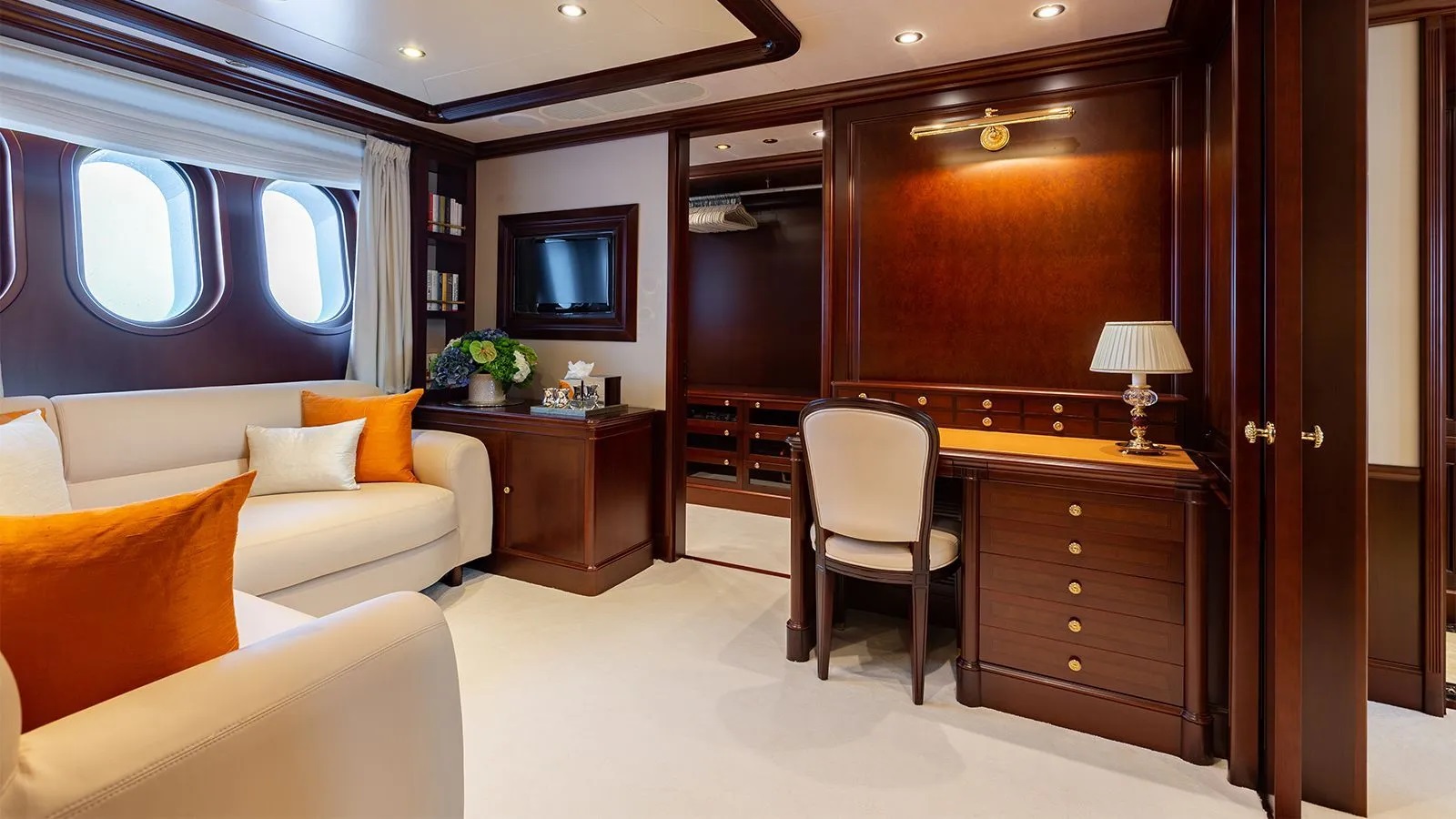 Forward on the main deck is the owner’s suite which boasts a private office and huge ensuite.