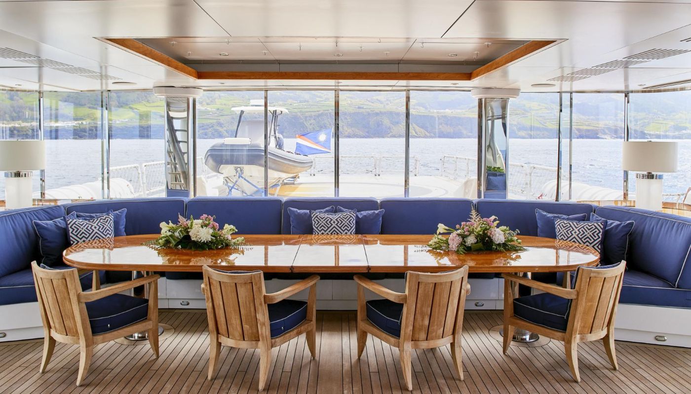 The main salon is on the bridge deck and features a large sofa, coffee table, dining area, wet bar and fabulous views. An adjoining aft deck boasts glass walls that can be removed; here guests may dine alfresco, and lounge in a climate controlled space, or enjoy the natural sea air ventilation.