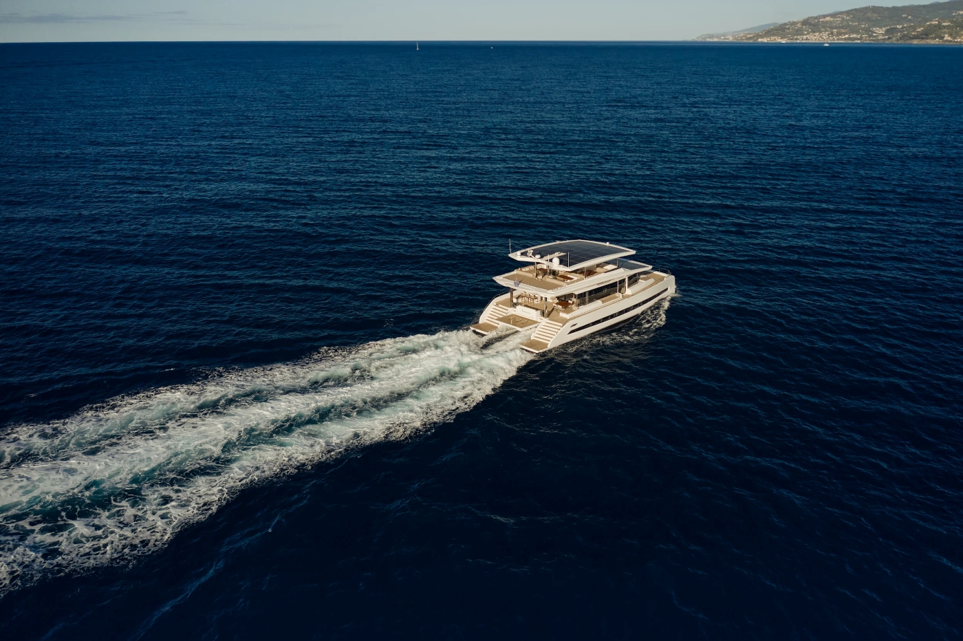 NOTABLE FEATURES OF ATRAVERSIA: ~Tri-deck catamaran ~Solar powered ~Silent cruising with low environmental impact ~Shallow draft ~Futuristic looks ~Stylish interior ~Air conditioning ~WiFi