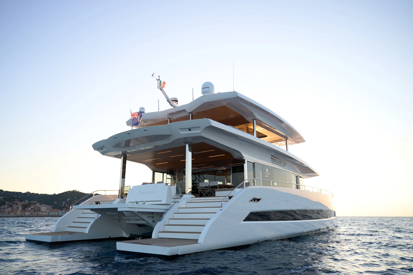 Super yacht ATRAVERSIA is a 24.30m (79’8”) VisionF E-Cat 80 Tri-deck Solar-powered Catamaran (2025) characterised by her futuristic good looks and solar-powered propulsion. She combines luxury with her eco-credentials and silent cruising ability. Up to nine guests can be accommodated in four suites looked after by a crew of four.
