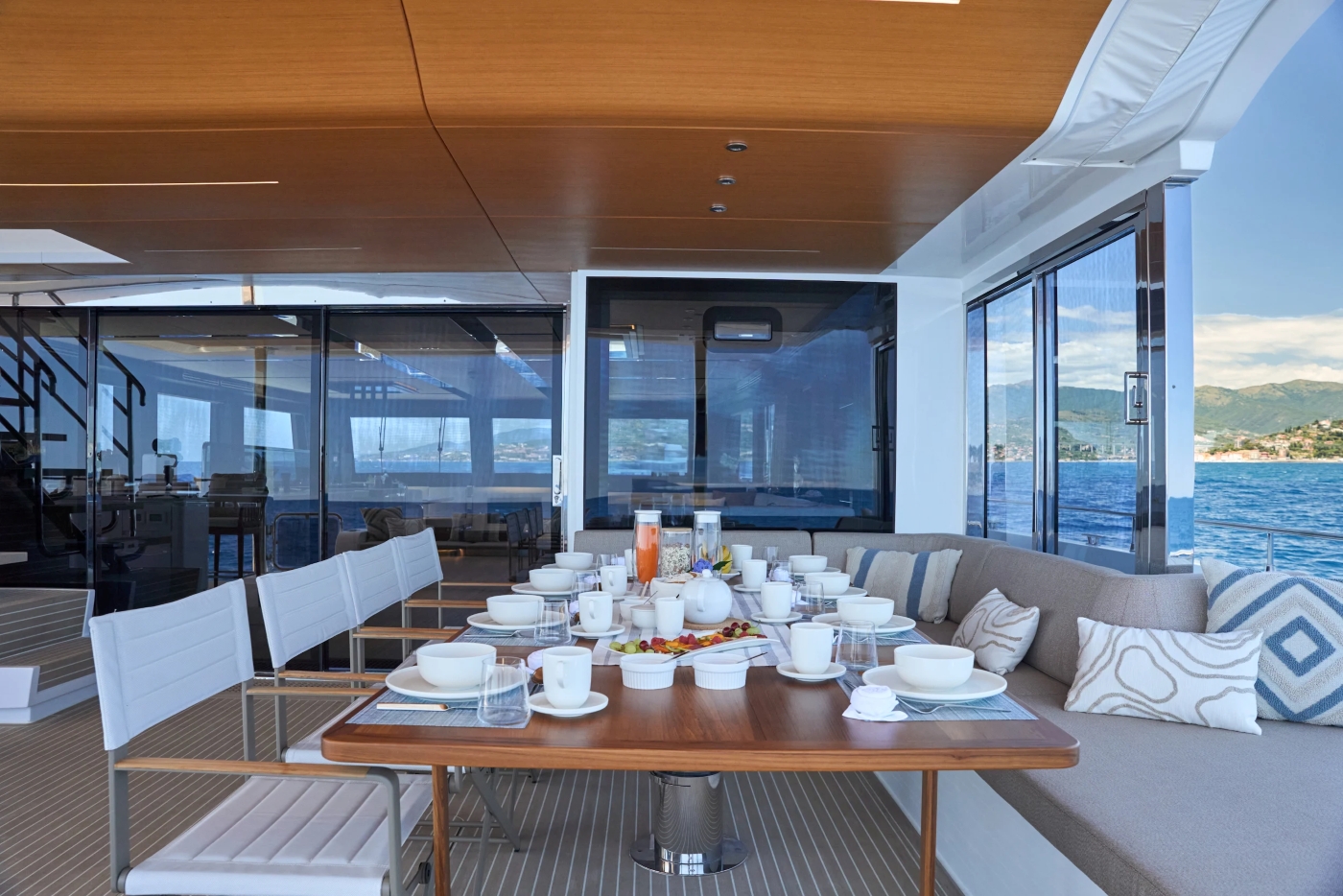 NOTABLE FEATURES OF ATRAVERSIA: ~Tri-deck catamaran ~Solar powered ~Silent cruising with low environmental impact ~Shallow draft ~Futuristic looks ~Stylish interior ~Air conditioning ~WiFi