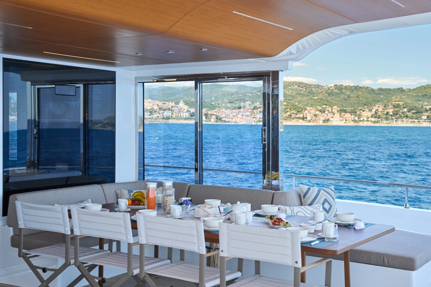 NOTABLE FEATURES OF ATRAVERSIA: ~Tri-deck catamaran ~Solar powered ~Silent cruising with low environmental impact ~Shallow draft ~Futuristic looks ~Stylish interior ~Air conditioning ~WiFi