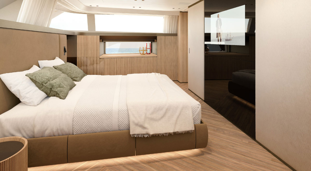 The main deck master suite is forward with access through a walk-in wardrobe and vanity area on the starboard side. The main space features a large aft facing bed and forward ensuite, with huge sweeping curved double vanity sinks and bench top and deluxe shower cubicle.