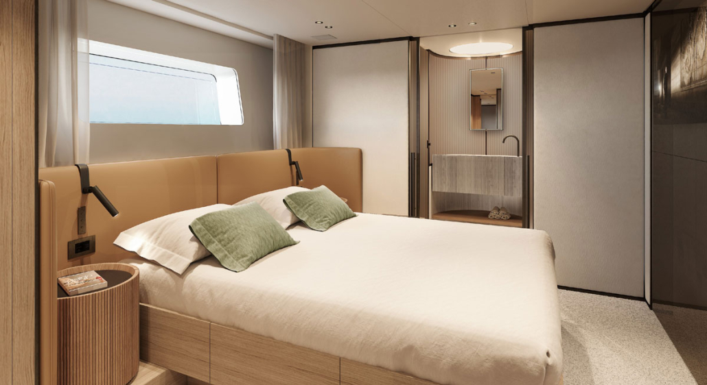 The main deck master suite is forward with access through a walk-in wardrobe and vanity area on the starboard side. The main space features a large aft facing bed and forward ensuite, with huge sweeping curved double vanity sinks and bench top and deluxe shower cubicle.
