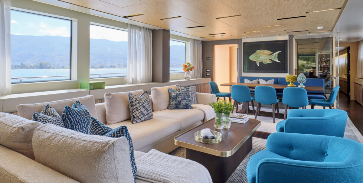 The main salon is a light and contemporary space which blends light wood finishes with neutral soft furnishings and accents of aquamarine blue. The mid-century inspired tables and chairs create a stylish feel throughout the aft lounge and forward dining room.