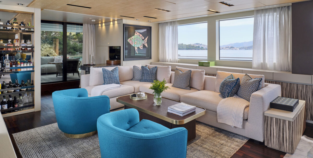 The main salon is a light and contemporary space which blends light wood finishes with neutral soft furnishings and accents of aquamarine blue. The mid-century inspired tables and chairs create a stylish feel throughout the aft lounge and forward dining room.