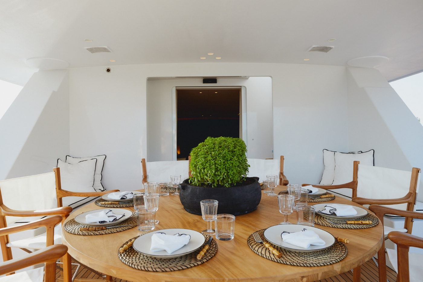 The main deck aft can accommodate everyone on board around the dining table making it the perfect spot to savour a leisurely al fresco dinner. There are steps down to the water’s edge swim platform from where the crew will launch the water toys.